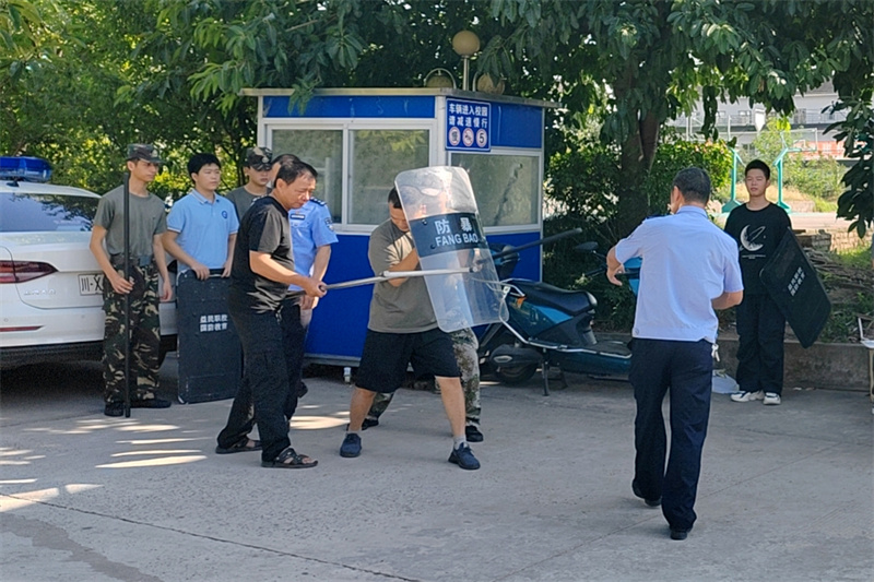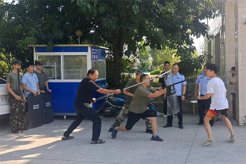培训前,朝阳派出所法治副校长、治安大队民警检查了校园“一键式”报警系统、视频监控等安防设施、设备运行情况,向学校安保人员详细讲解了操作程序和维护方法,并从校园安全职责、巡逻重点、门禁管理等多个方面进行交流,让安保队员对其工作职责有了更清晰的认识和提高。培训中,法治班主任指导学校建立健全突发事件应急预案,组建完善“最小应急单元”,向安保人员具体讲解了盾牌、钢叉、长棒等器械操作、使用,并现场进行演示。