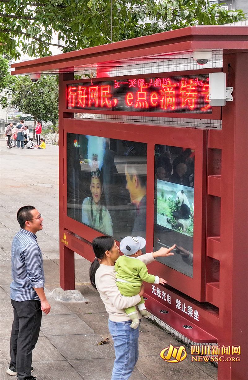 | 10月8日傍晚,四川省华蓥市豪迈国际小区的居民带着小孩,在安置于小区内的“AI综合服务平台”终端展示屏前观看大熊猫。 |