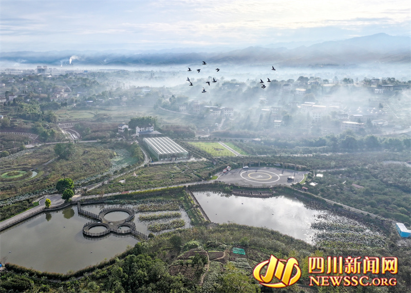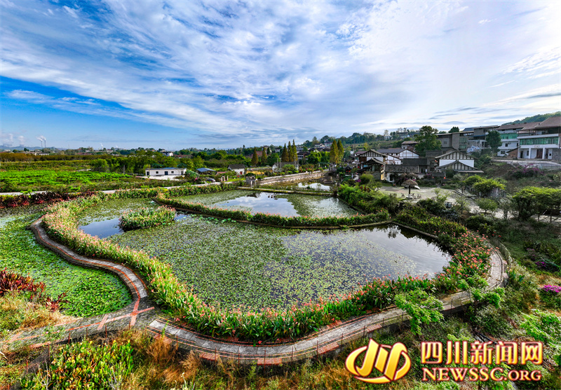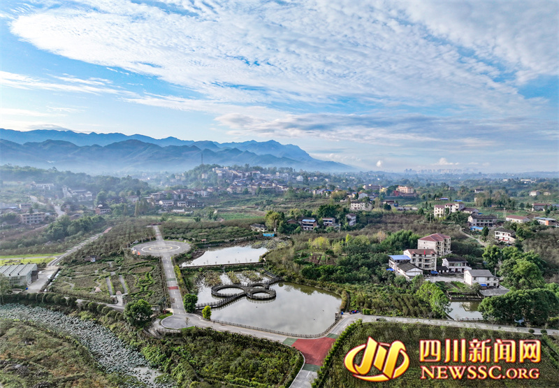 | 10月22日,四川省华蓥市禄市镇凉水井村生态园在蓝天白云映衬下显得格外和美。(摄影 冉鹏) |