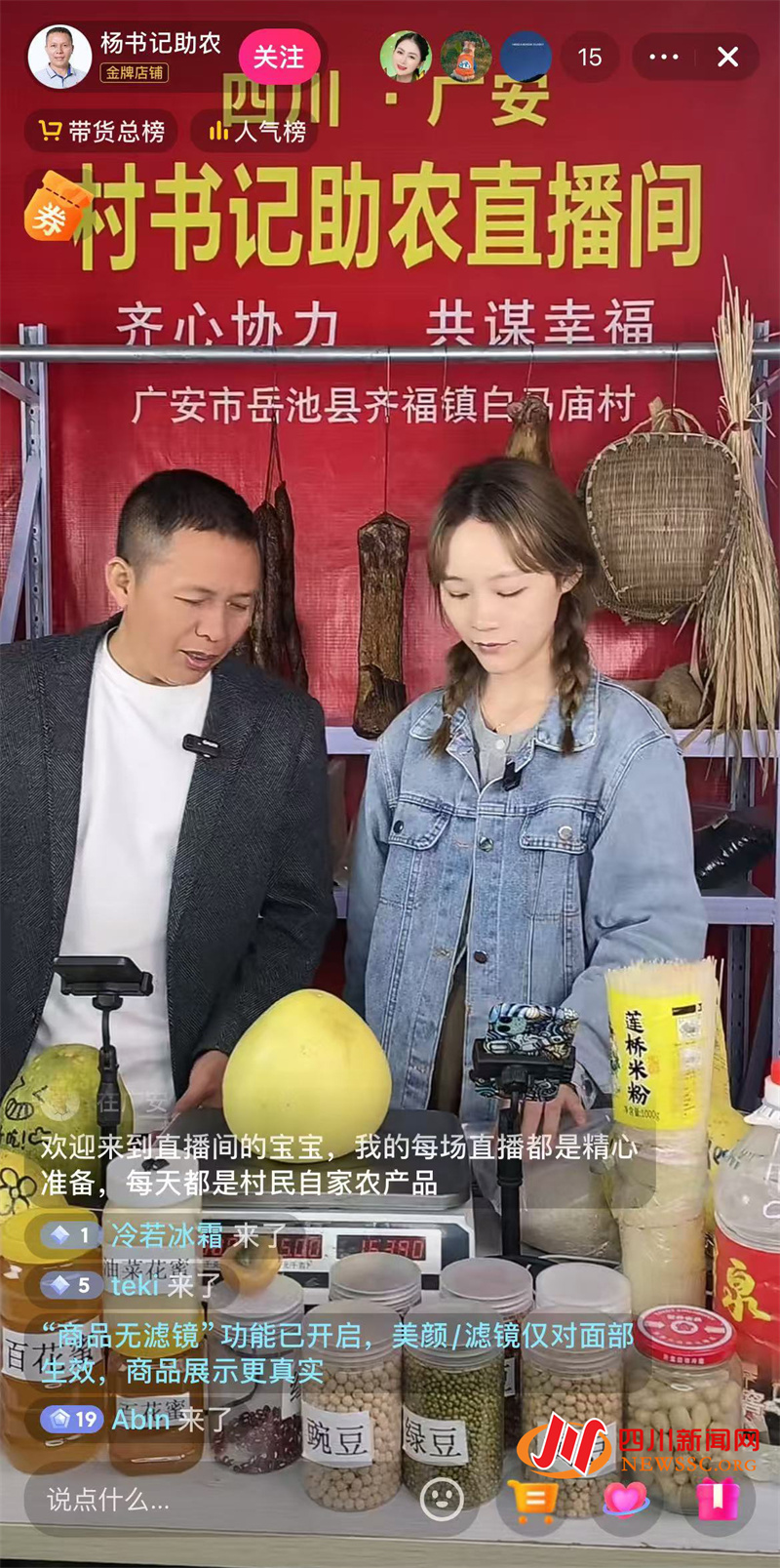 十几平的直播间内,红色背景墙上写着“四川·广安 村书记助农直播间”,杨孝波操着一口“川普”,娴熟地介绍着桌上的南瓜、皂角、土鸡蛋等农家土特产,每场直播通常持续3个多小时。