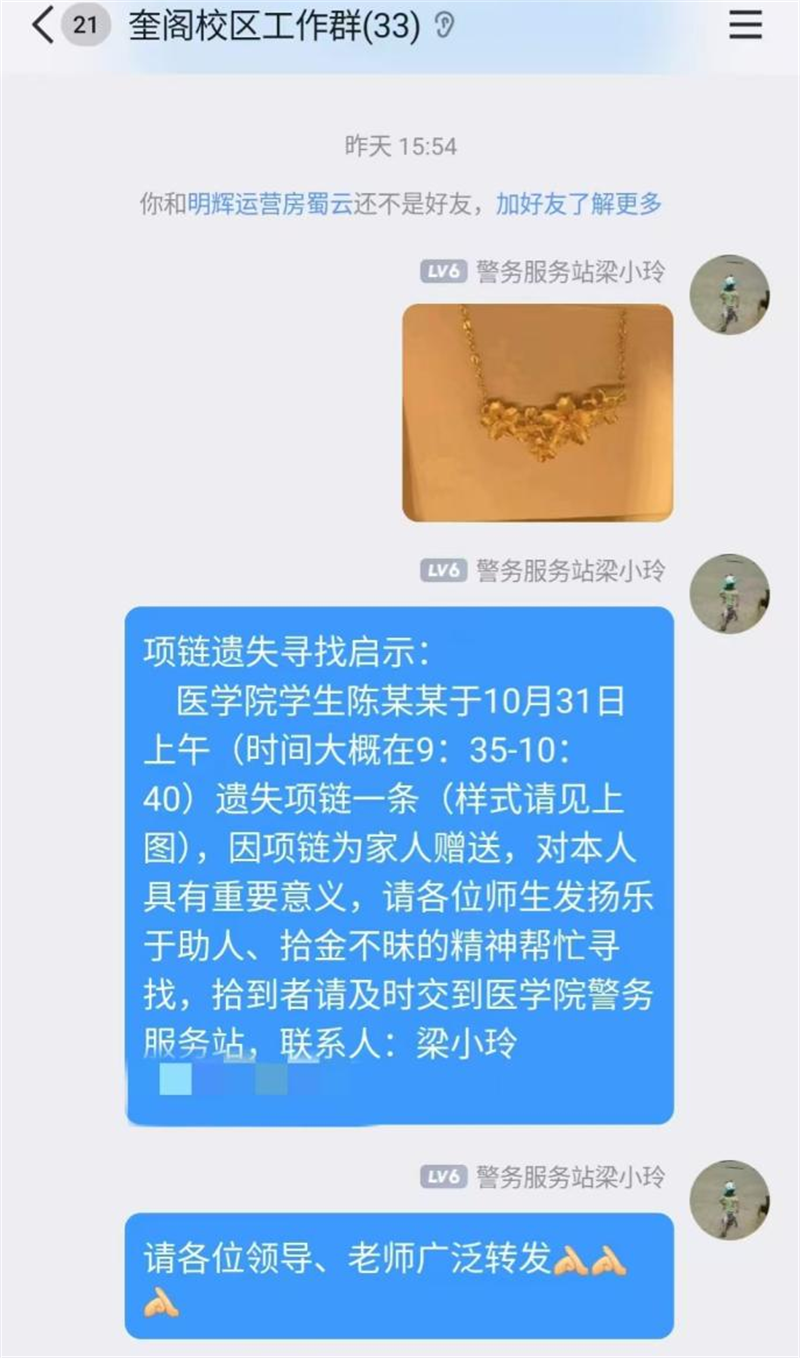 功夫不负有心人,2024年11月1日一早,一名同学带着项链来到了警务服务站“我昨晚在操场捡到的,但是时间太晚了,怕打扰你们,今天一早我就赶紧送过来了。”