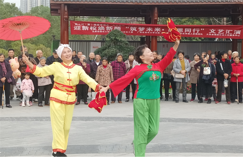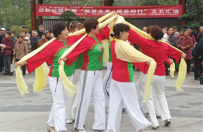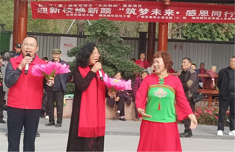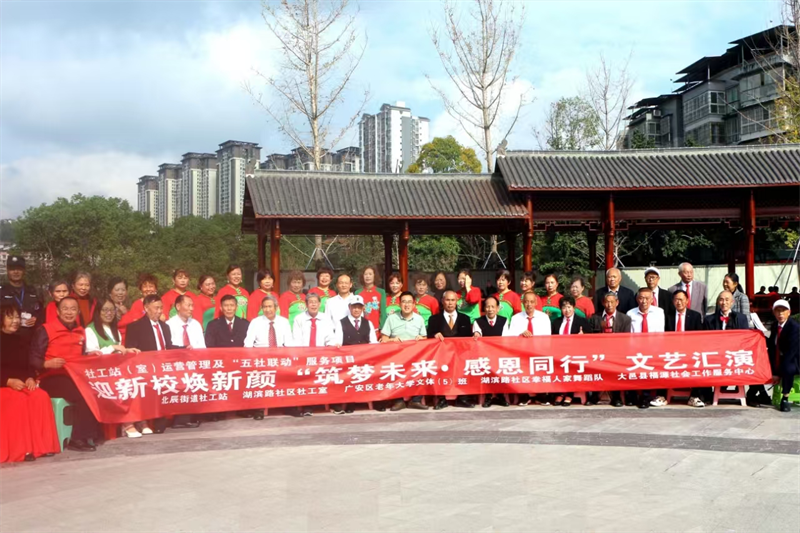 2024年11月14日,广安市广安区北辰街道湖滨路社区在区委社会工作部、北辰街道办事处的指导下,携手北辰街道社工站、广安区老年大学文体(5)班、湖滨路社区幸福人家舞蹈队、大邑县福源社会工作服务中心等多方力量共同举办了迎新校换新颜“筑梦未来,感恩同行”文艺汇演。此次活动旨在庆祝广安区老年大学换新貌,同时展现湖滨路社区老年人积极向上的生活态度与才华才艺。此次活动有40位老人参与表演。