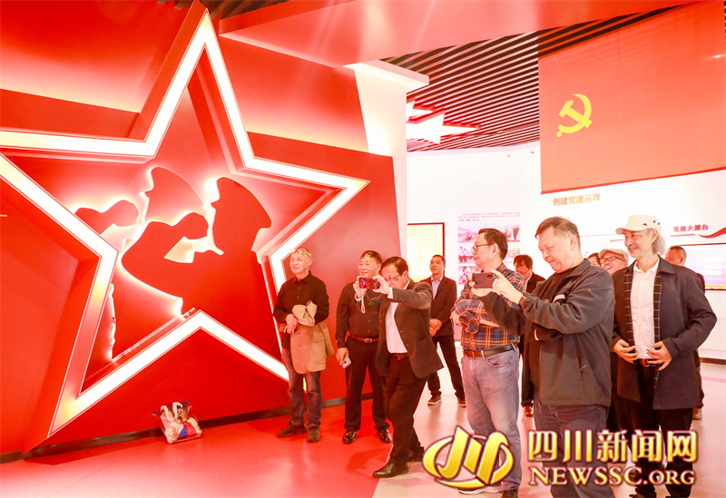 | 在川渝两地开展的“深入生活,扎根人民”主题采风活动中,作家们在华蓥市禄市镇的“三红”广场展厅观看红色影像。 |