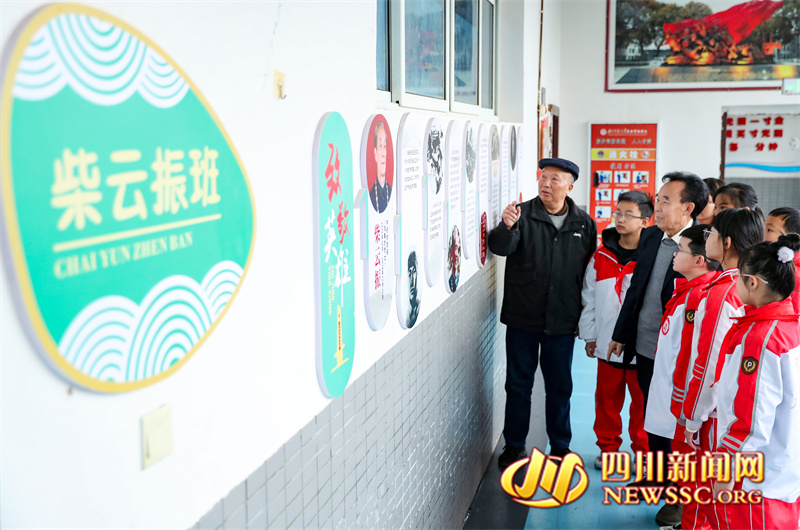 | 文阳清(左二)等爱心人士在广安启睿第一实验学校与“柴云振班”的学生共同重温柴云振的英雄事迹。 |