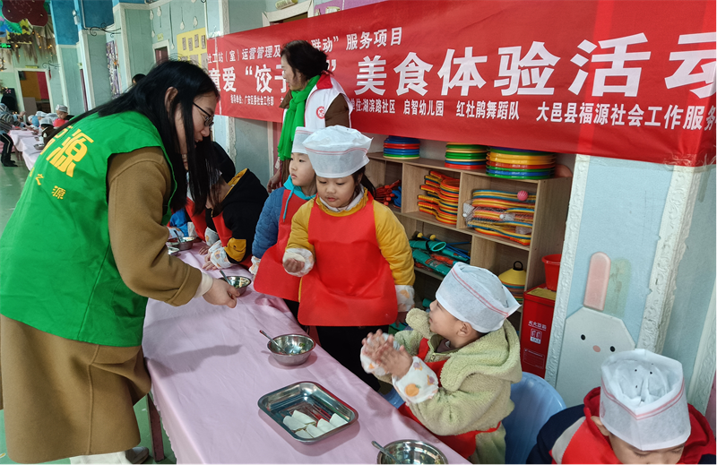 在社工站(室)“五社联动”服务项目的推动下,12月31日,一场温馨欢乐的童爱“饺子香”美食体验活动在启智幼儿园成功举办,此次活动由广安区委社会工作部指导,北辰街道办事处主办,湖滨路社区、启智幼儿园、红杜鹃舞蹈队以及大邑县福源社会工作服务中心共同承办。