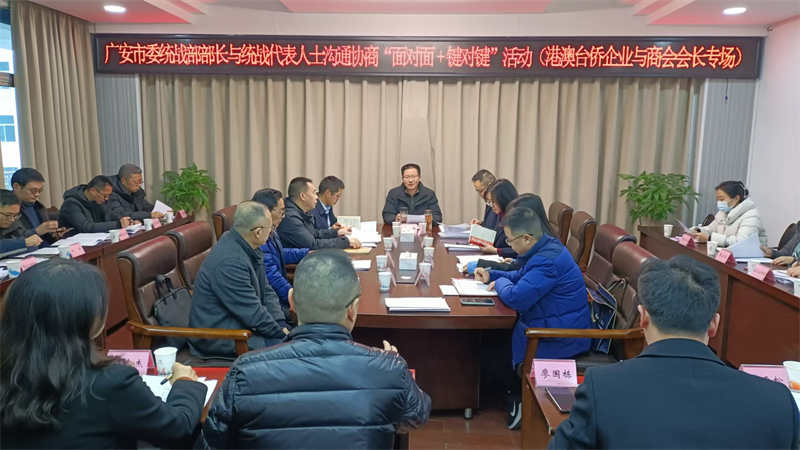 12月30日下午,广安市委统战部部长与统战代表人士沟通协商“面对面+键对键”活动(港澳台侨企业和商会会长专场)在市委二楼二会议室举行。市委统战部常务副部长、市台办主任舒伟主持会议并讲话,市委统战部副部长、市工商联党组书记朱大均,市委统战部二级调研员刘建红等参加会议。