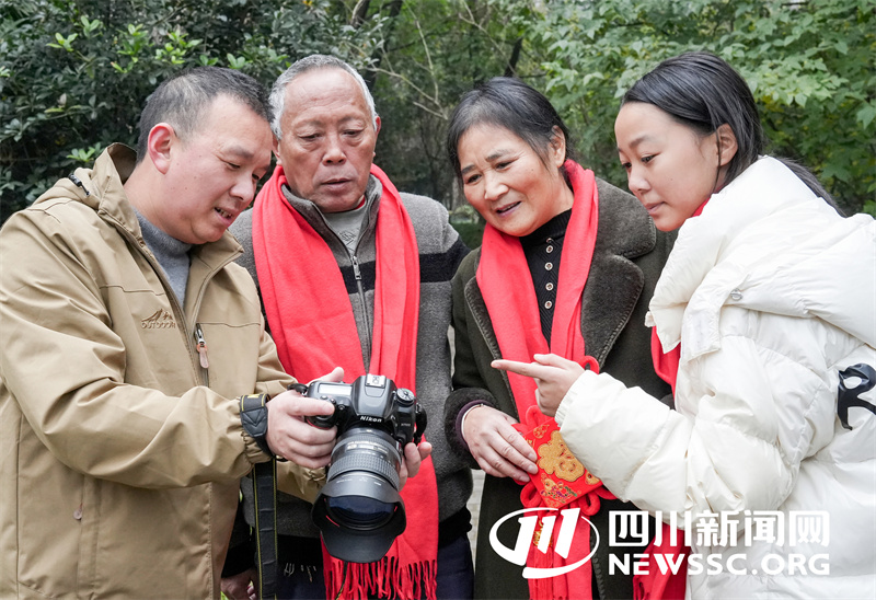 | 1月4日,四川省广安华蓥市“四川好人”殊荣获得者何昌淑(右二),与家人在欣赏摄影志愿者义务为他家拍摄的“全家福”。 |