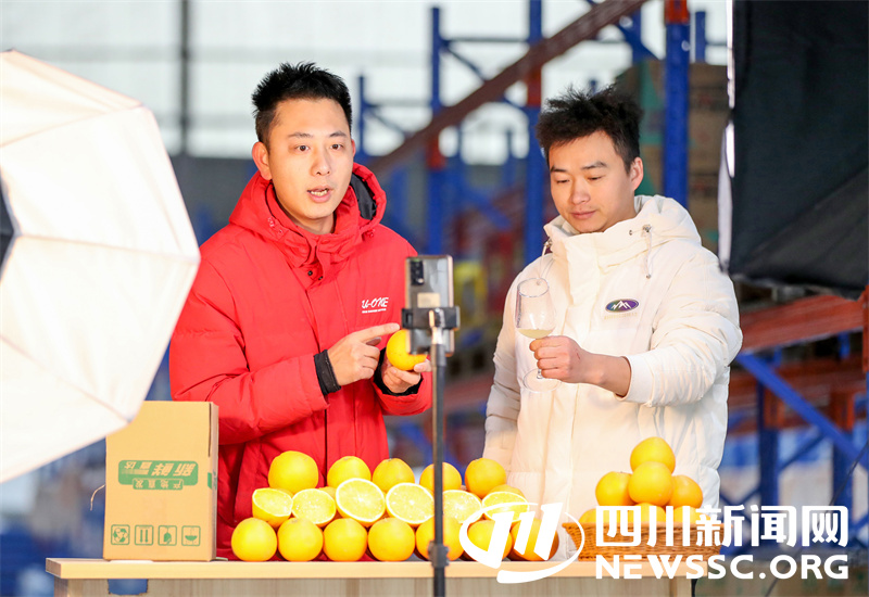 | 1月6日,四川省华蓥市“京东云仓”电商产业园的工作人员,在线上直播推销当地特色时令水果脐橙、蜜桔等“迎春水果”。 |