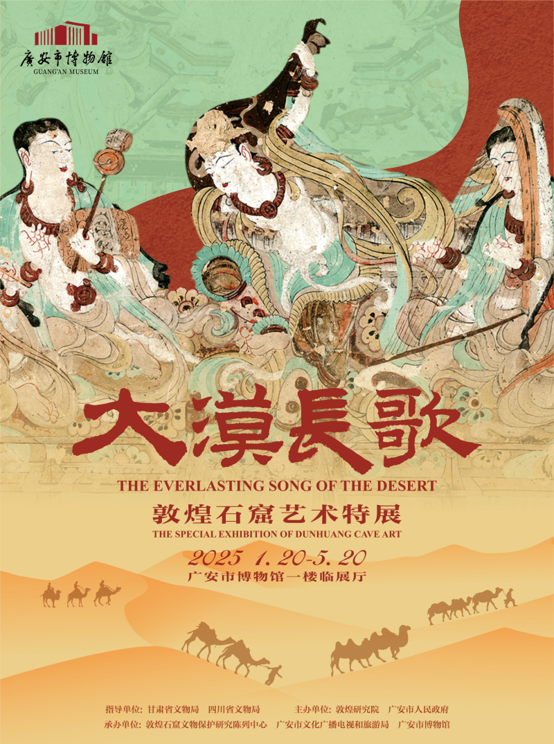 “大漠长歌—敦煌石窟艺术特展”是广安市博物馆开馆以来首次引进的重量级文博大展,千年敦煌的文化瑰宝跨越 2000 公里的漫漫征途,即将于2025年春节前,呈现在广大观众面前,为广安文化艺术领域增添浓墨重彩的华章。此次特展由甘肃省文物局、四川省文物局指导,敦煌研究院、广安市人民政府主办,敦煌石窟文物保护研究陈列中心、广安市文化广播电视和旅游局和广安市博物馆承办,展期4个月,持续到5月20日。