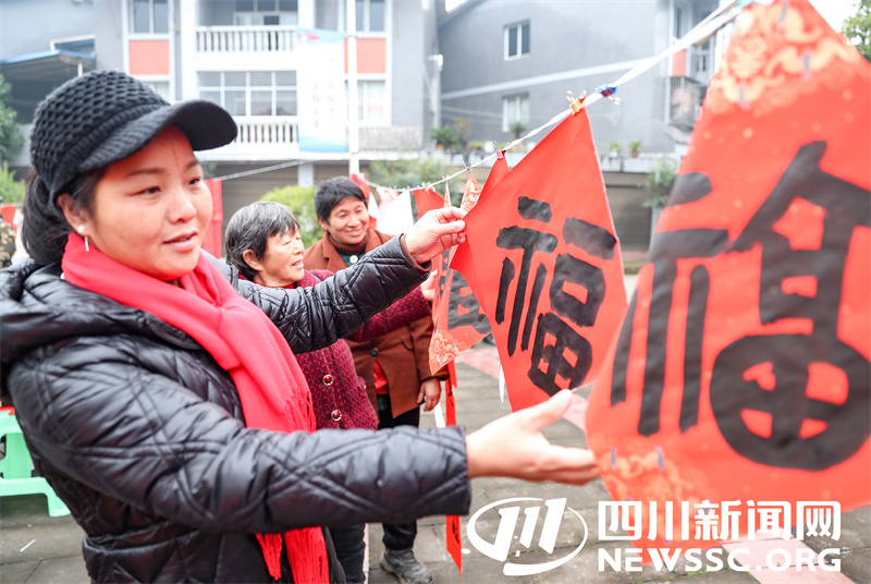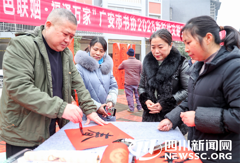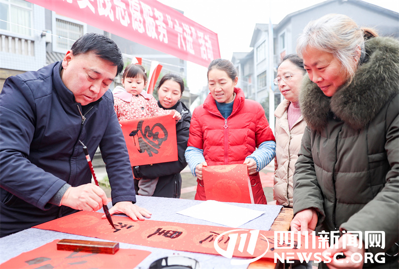 1月15日,四川省广安市文联组织书法家协会开展“红色联姻,福泽万家”新时代文明实践志愿服务“六进”活动的书法志愿者,深入华蓥山区为返乡团年的务工人员和乡亲义务书写春联和“福”“春”字等门贴,祝福山区群众过上一个快乐祥和的新春佳节。