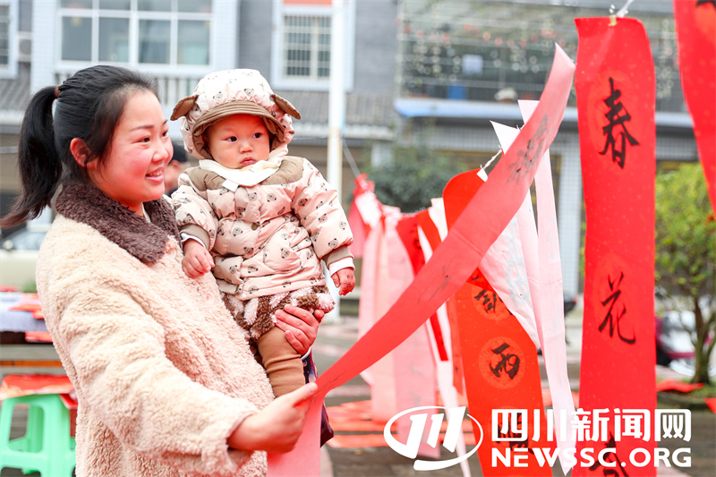 | 1月15日,四川省广安市华蓥市永兴镇马架坪村的一对母子,在村头的文体广场选取书法志愿者为他们义务书写的春联。 |