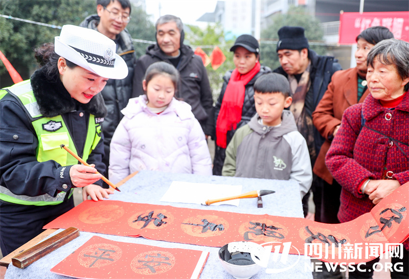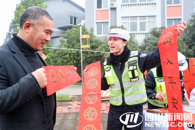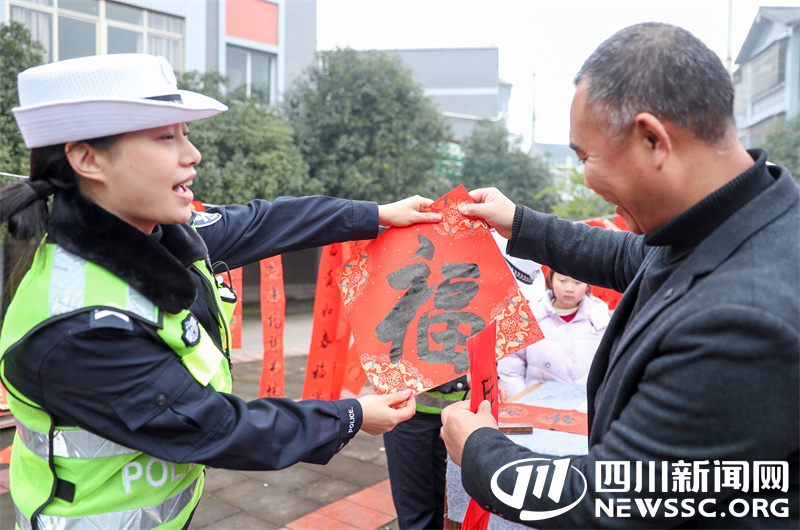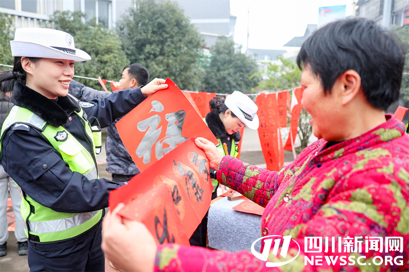 新春佳节临近,四川省华蓥市公安局交通警察大队组织书法爱好者巡回到乡村,为返乡团年的务工人员和乡亲义务书写赠送“交安春联”和平安“福”“春”字等门贴,提醒乡亲在春节期间走亲访友不酒后开车、平安出行,祝福乡亲过上一个快乐平安的佳节。