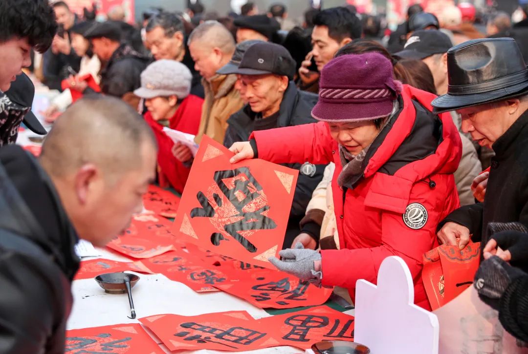在摄影作品展的对面,市民们围绕着书法老师的案桌,热情洋溢地挑选着自己中意的春联。书法家们将新春的祝福与对未来的美好期许,融入每一笔每一划之中。一副副寓意吉祥的春联、一张张喜气洋洋的大红“福”字跃然纸上,传递着对新春的祈愿和对幸福生活的向往。