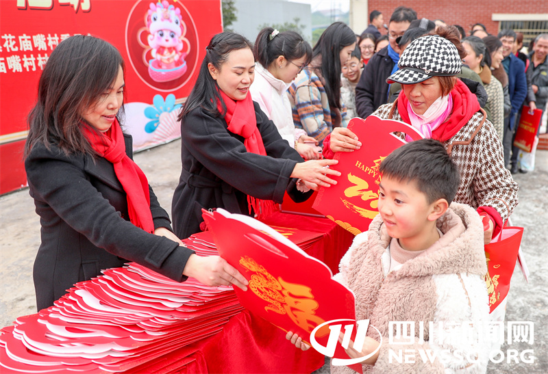 | 1月21日,四川省广安市社会保险局组织的“社保蓝”志愿服务队在华蓥市高兴镇花庙嘴村的文体广场,为返乡团年的务工人员和乡亲赠送装有春联、“福”字及社保宣传资料大礼包。 |