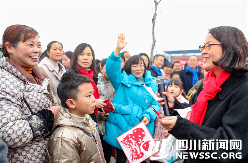 | 1月21日,四川省广安华蓥市高兴镇花庙嘴村返乡团年的务工人员和乡亲,在村头的文体广场互动抢答社保知识。 |