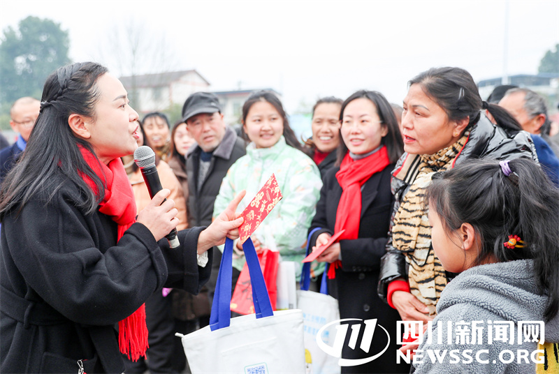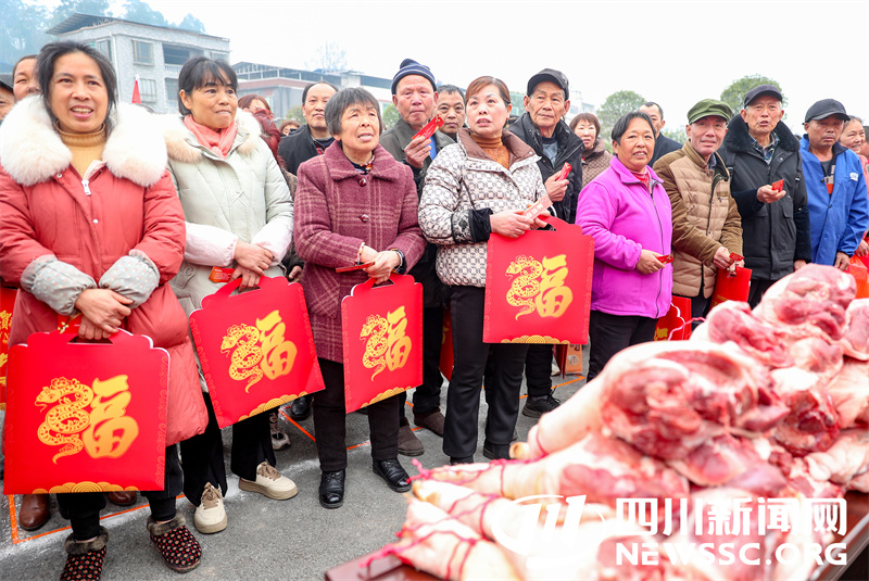| 1月21日,四川省广安华蓥市高兴镇花庙嘴村返乡团年的务工人员和乡亲,在村头的文体广场互动抢答社保知识并领取获胜奖品猪肉等年货。 |