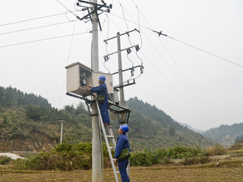 国网邻水供电有限公司供电所工作人员在邻水县石永镇汤巴丘村检查配电变压器运行情况,保障村民春节可靠用电