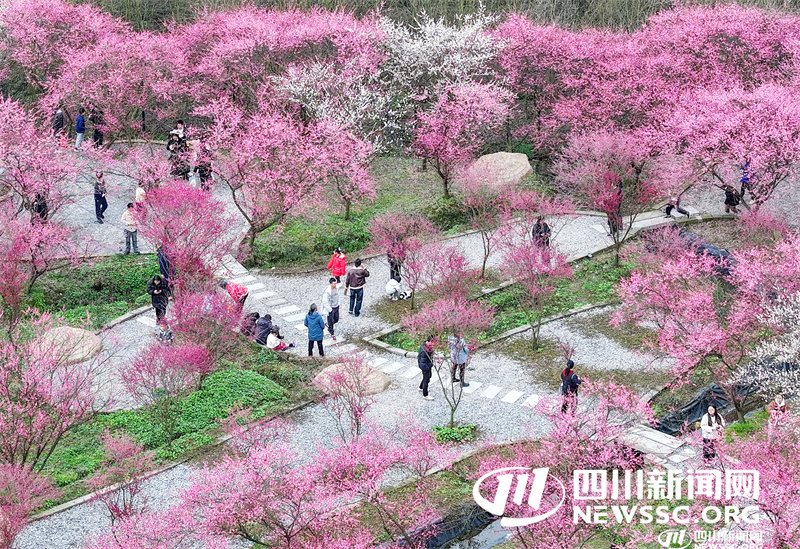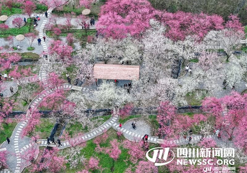 | 2月15日,市民利用周末在四川省广安华蓥市禄市镇凉水井村生态园游览灼灼其华的梅花,乐享春天的气息和乡村振兴带来的成果。(无人机照片) |