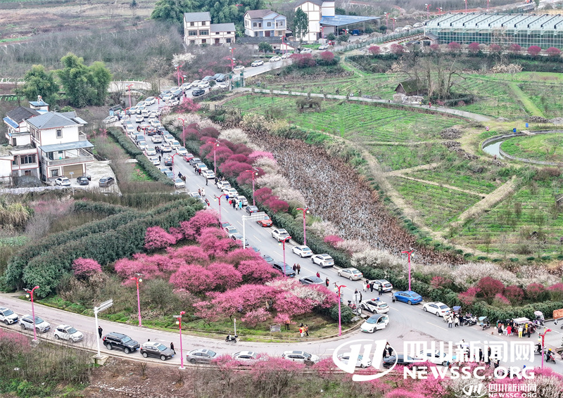 | 2月15日,自驾游的市民利用周末在四川省广安华蓥市禄市镇凉水井村生态园游览竞相绽放的梅花,乐享春天的气息和乡村振兴带来的成果。(无人机照片) |