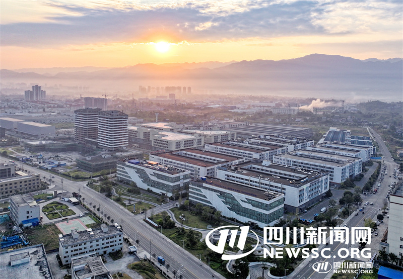 | 鸟瞰晨曦映照下的四川省华蓥市民营企业发展平台华蓥山经开区一角。 |