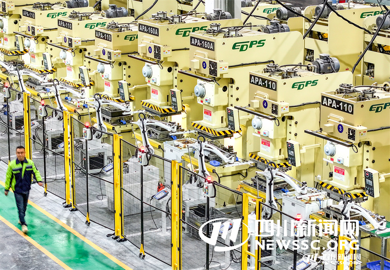 | 在四川省华蓥市民营企业发展平台华蓥山经开区,四川怡田科技有限公司员工在车间巡视智能设备运转情况。 |