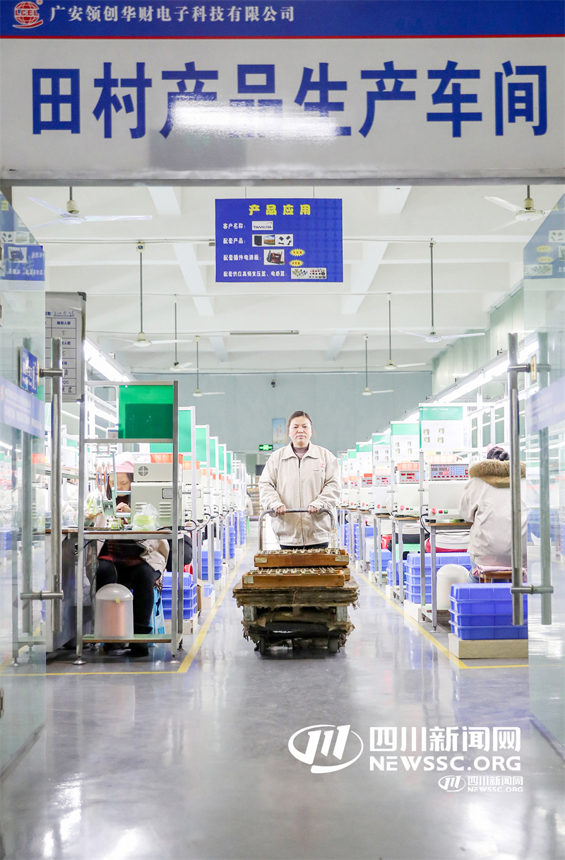 | 在四川省华蓥市民营企业发展平台华蓥山经开区,华蓥山领创电子有限公司田村产品生产车间的员工在生产流水线上转运材料。 |