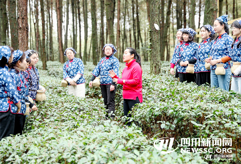 3月6日,四川省华蓥市融媒体中心女记者在华蓥山区的龙滩镇水源村,听取当地茶农传授茶叶采摘知识,感受茶文化的魅力,在开心中迎接“三八”国际妇女节来临。