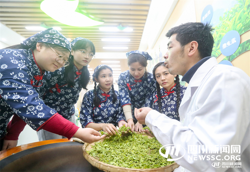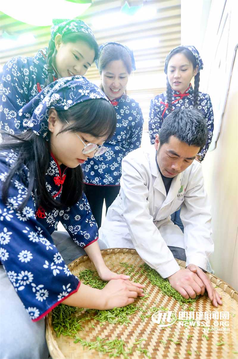 3月6日,四川省华蓥市融媒体中心女记者在华蓥山区的龙滩镇水源村,听取当地茶农传授种茶叶炒制知识,感受茶文化的魅力,在开心中迎接“三八”国际妇女节来临。