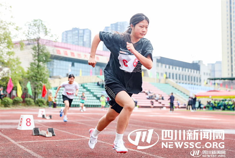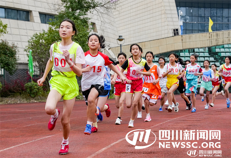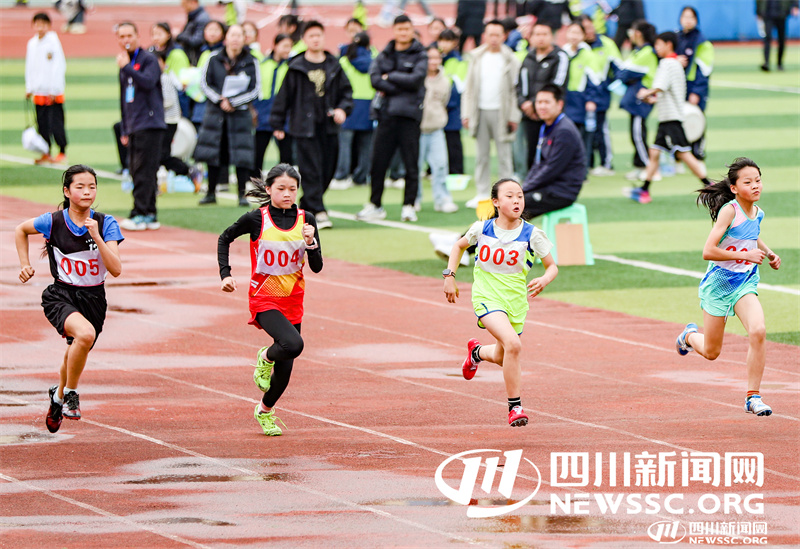 3月14日,四川省华蓥市参加2025年春季中小学生田径运动会的女子选手在赛场奋力奔跑。