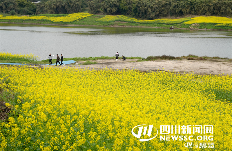 四川省华蓥市明月镇竹河村在枯水期岸边露出的滩涂地种上油菜,花开时节,波光粼粼的水面与金黄色的油菜花海形成了“水上花海”的动人景观,吸引游客前来观赏打卡,既增加了村民的收入,又带动了乡村旅游。