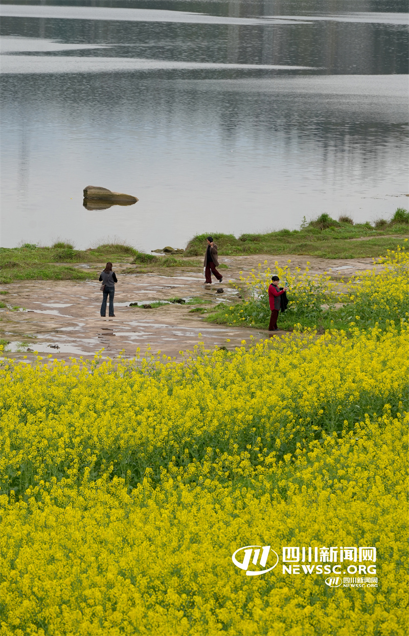 3月16日,在四川省华蓥市明月镇竹河村渠江岸边的滩涂地上,游客在欣赏盛开的油菜花。