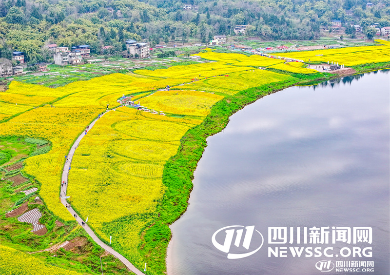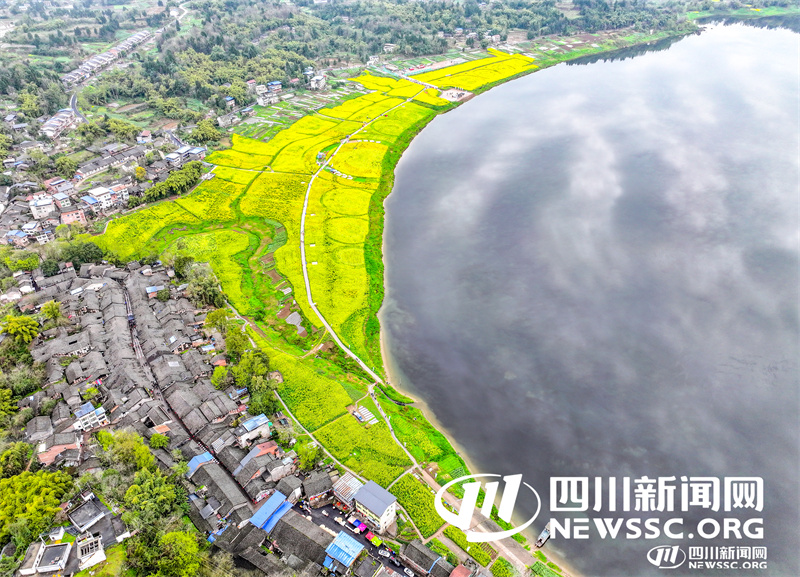 | 3月15日,四川省广安市广安区肖溪镇灼灼其华的油菜花,把长江支流渠江和岸边的肖溪古镇装点得格外美丽迷人。(无人机照片) |