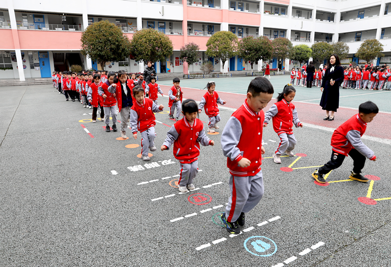 3月13日,在广安市广安区东方小学操场,学生在参加“课间体育超市”里的地面统感训练游戏。