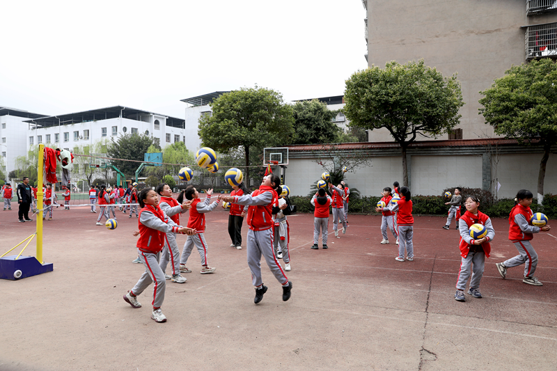 3月13日,在广安市广安区东方小学操场,学生在参加课后服务体育锻炼,进行排球对抗基础训练。